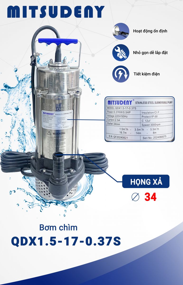 Bơm chìm QDX1.5-17-0.37S là dòng bơm dân dụng nhỏ gọn, hoạt động bằng điện 1 pha 220V, công suất 0.37kW (tương đương 0.5HP). Sản phẩm có: