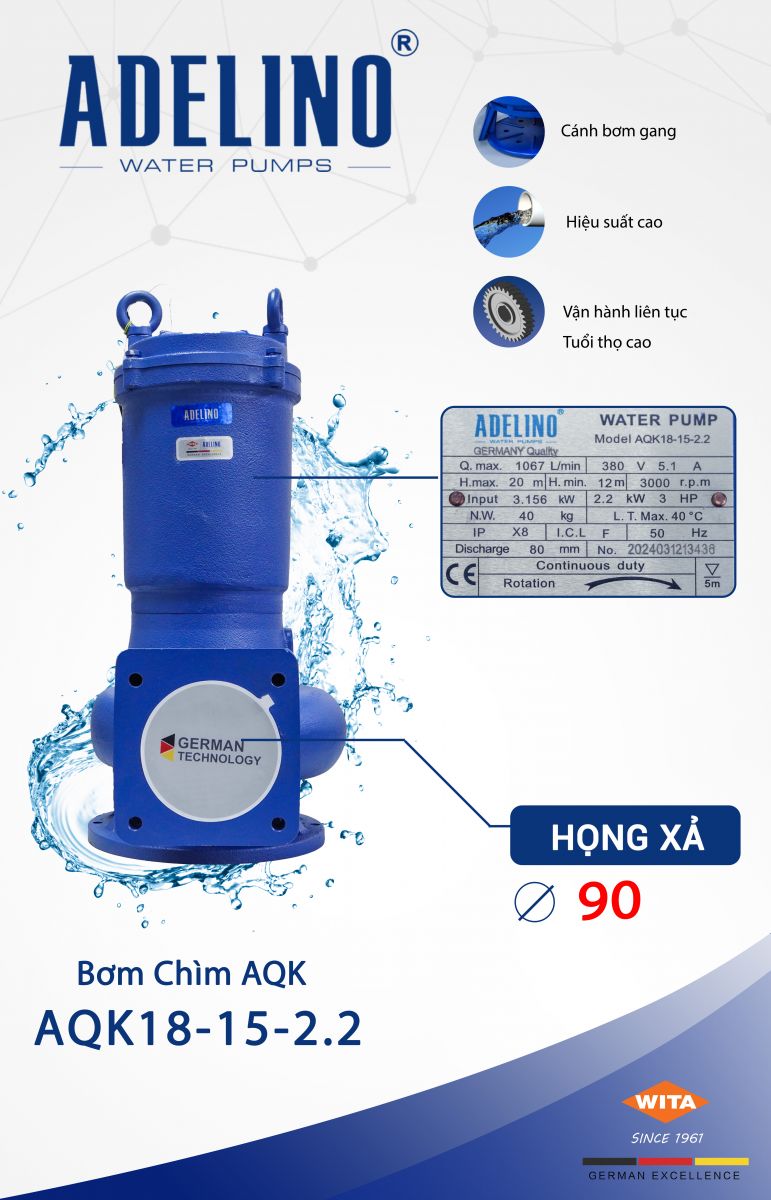 Bơm chìm nước thải ADELINO thuộc dòng bơm chìm công suất cao, dùng để bơm nước thải chứa tạp chất, nước bẩn, bùn loãng, chất lỏng có lẫn cặn hữu cơ hay vô cơ. Sản phẩm được thiết kế chìm hoàn toàn trong nước, motor kín nước chuẩn IPX8, giúp vận hành an toàn và ổn định trong điều kiện độ ẩm cao và ngập nước.