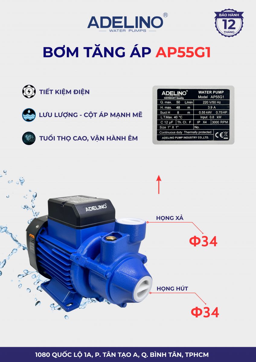 Thương hiệu Adelino nổi tiếng với tiêu chuẩn chất lượng châu Âu, mang đến các dòng máy bơm bền bỉ, tiết kiệm điện và phù hợp khí hậu Việt Nam. Nếu bạn đang tìm một thiết bị vừa mạnh, vừa bền và có thể sử dụng lâu dài, AP55G1 là lựa chọn lý tưởng cho gia đình và cửa hàng.