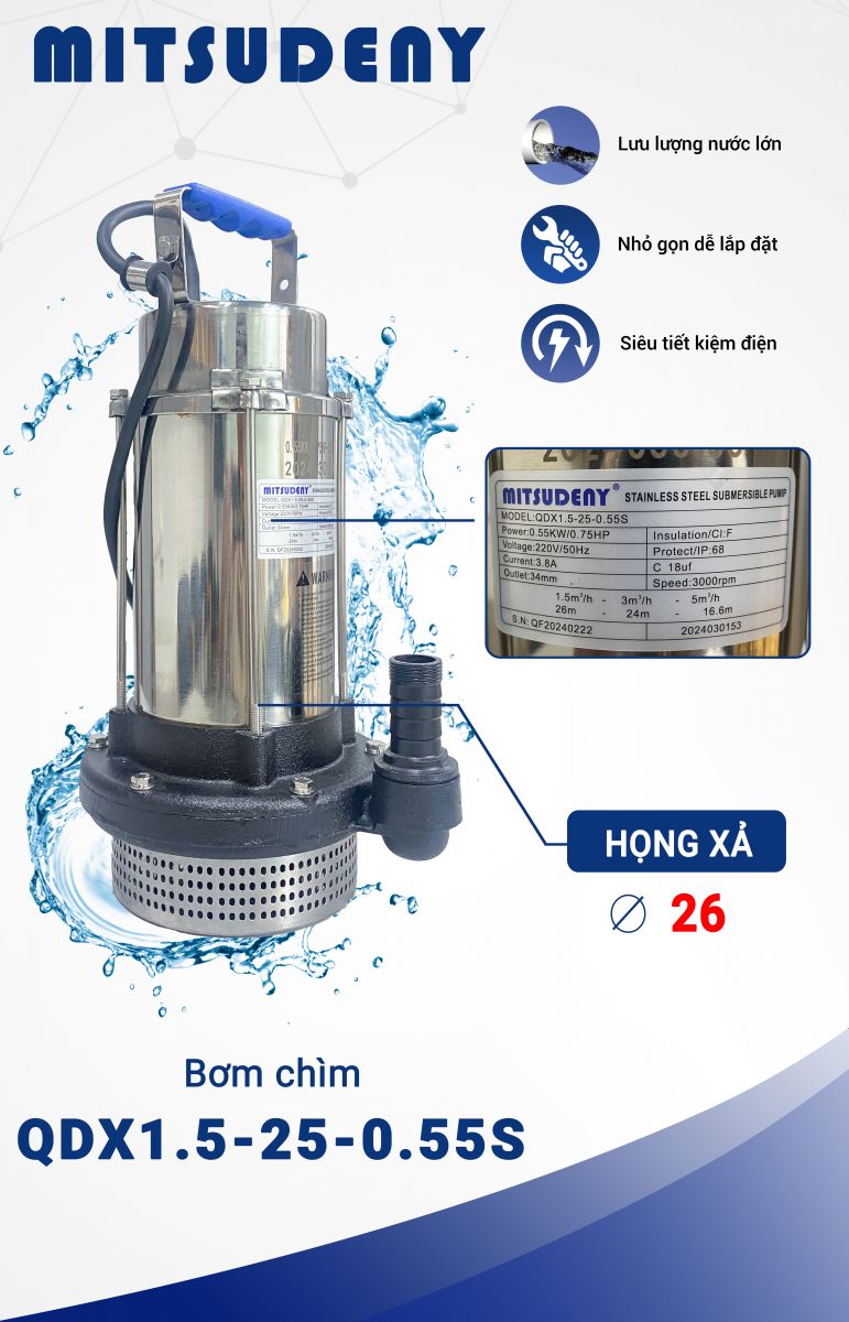 Trong các công trình dân dụng, nông nghiệp hoặc xử lý nước thải, việc lựa chọn loại bơm phù hợp đóng vai trò quan trọng trong hiệu suất và tuổi thọ hệ thống. Một trong những thiết bị được đánh giá cao hiện nay là bơm chìm QDX 1.5-25-0.55S – sản phẩm nổi bật nhờ khả năng vận hành ổn định và nhiều ưu điểm vượt trội so với bơm nổi truyền thống.